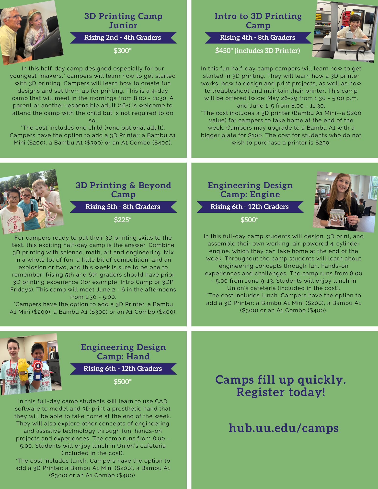 The earlier, the better! All of our camps are limited by the number of computers and printers we have available, so sign up early to ensure you have a spot. The camps usually do fill up. We will keep registration open until camps are full, but you must register by May 1 to guarantee a T-shirt size and to avoid a $50 late registration fee.